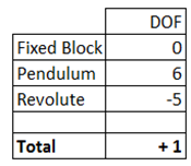 A pendulum is connected to a fixed block using a revolute joint. The revolute constraint removes 5 DOF from the pendulum and leaves 1 rotational DOF.